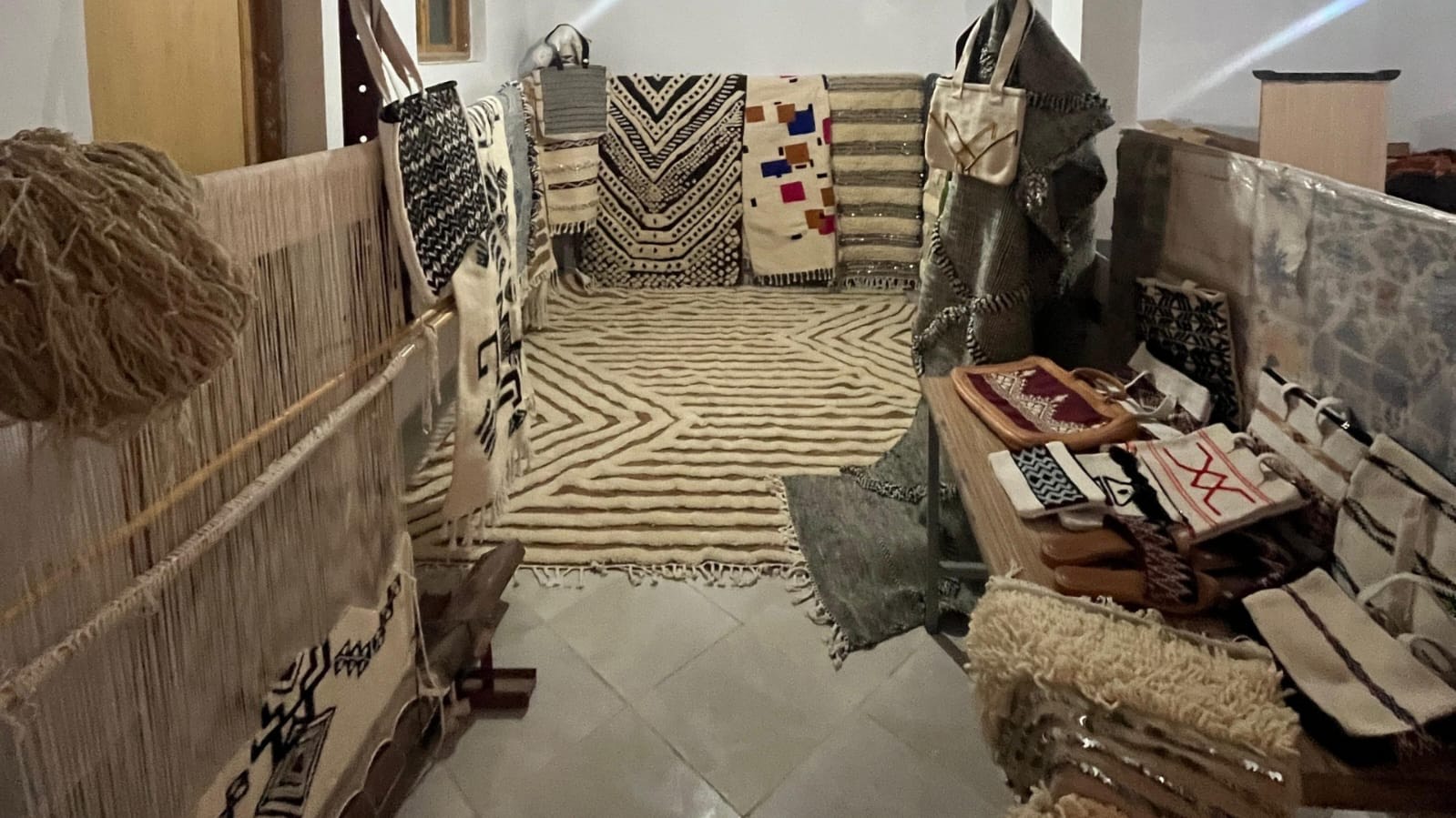 Alongside carpet production, the cooperative is active in sewing and embroidery, developing handcrafted products inspired by Moroccan heritage. To diversify our work, we also create innovative items from carpet materials, such as handbags, laptop cases, accessories, and jewelry, including earrings made from carpet elements.