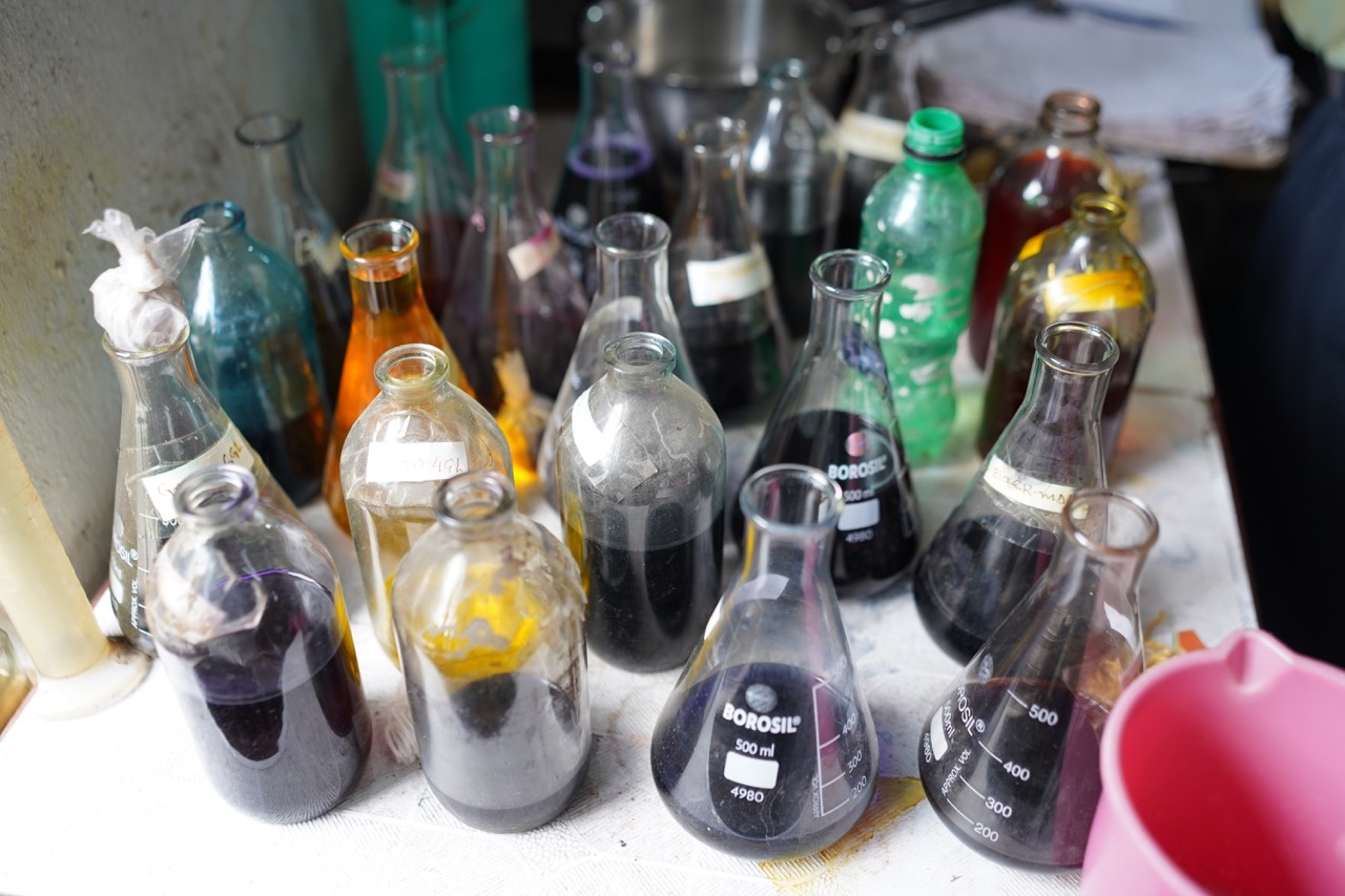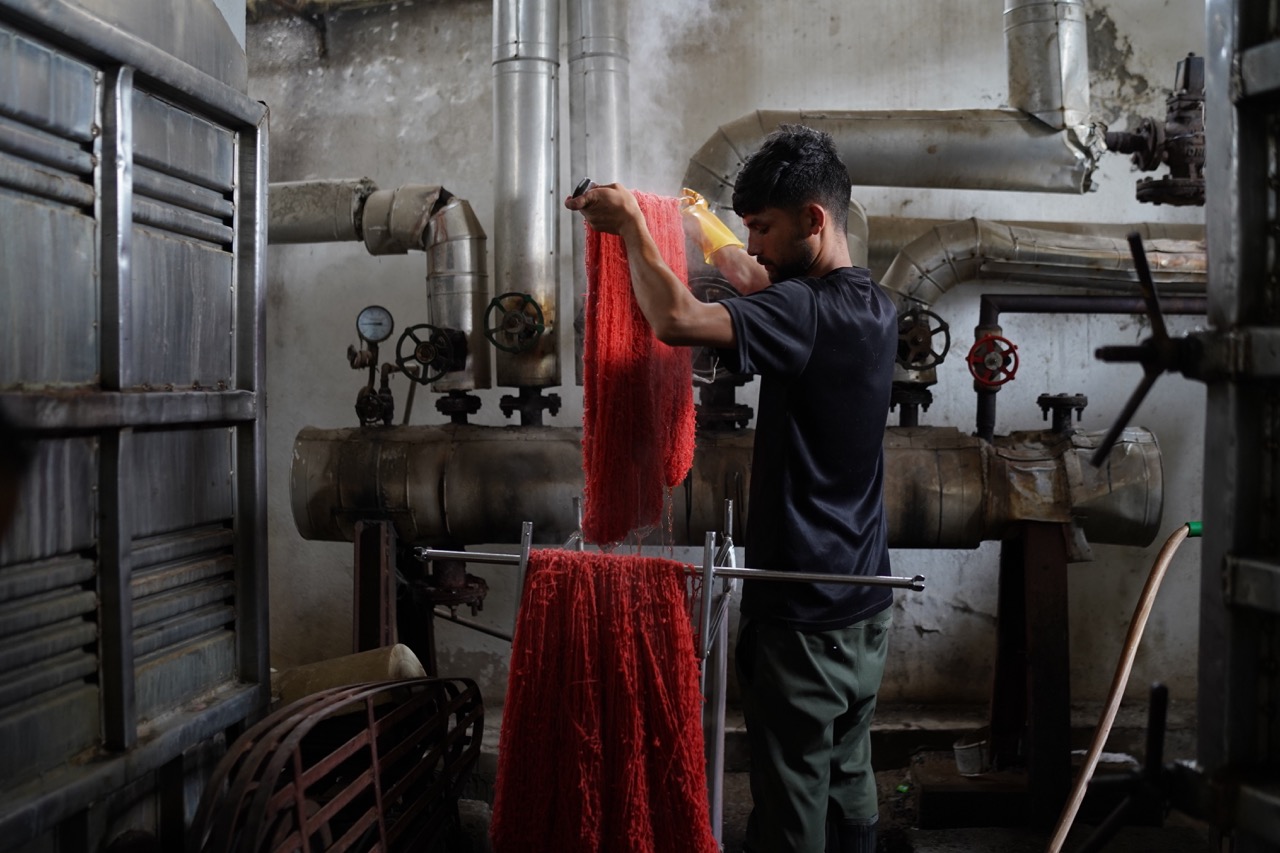 Dyeing has evolved over time, and its industry has changed with it. Early carpet production relied on natural dyes from goods such as walnut husks and turmeric. Though this method can produce beautiful results, it has limited colour palettes and lengthy and difficult dyeing processes. The introduction of vegetable dyes and imported high quality synthetic dyes expanded the possibilities. These new dyes offered not only greater colour options but also colour consistency and durability. However, the arrival of cheap dyestuffs—often imported from China or India—also introduced substances with higher toxicity and environmental impact, including Azo dyes, some of which are known to be carcinogenic. Today, synthetic dyes remain the most commonly used in the industry, yet their use is largely unmonitored.