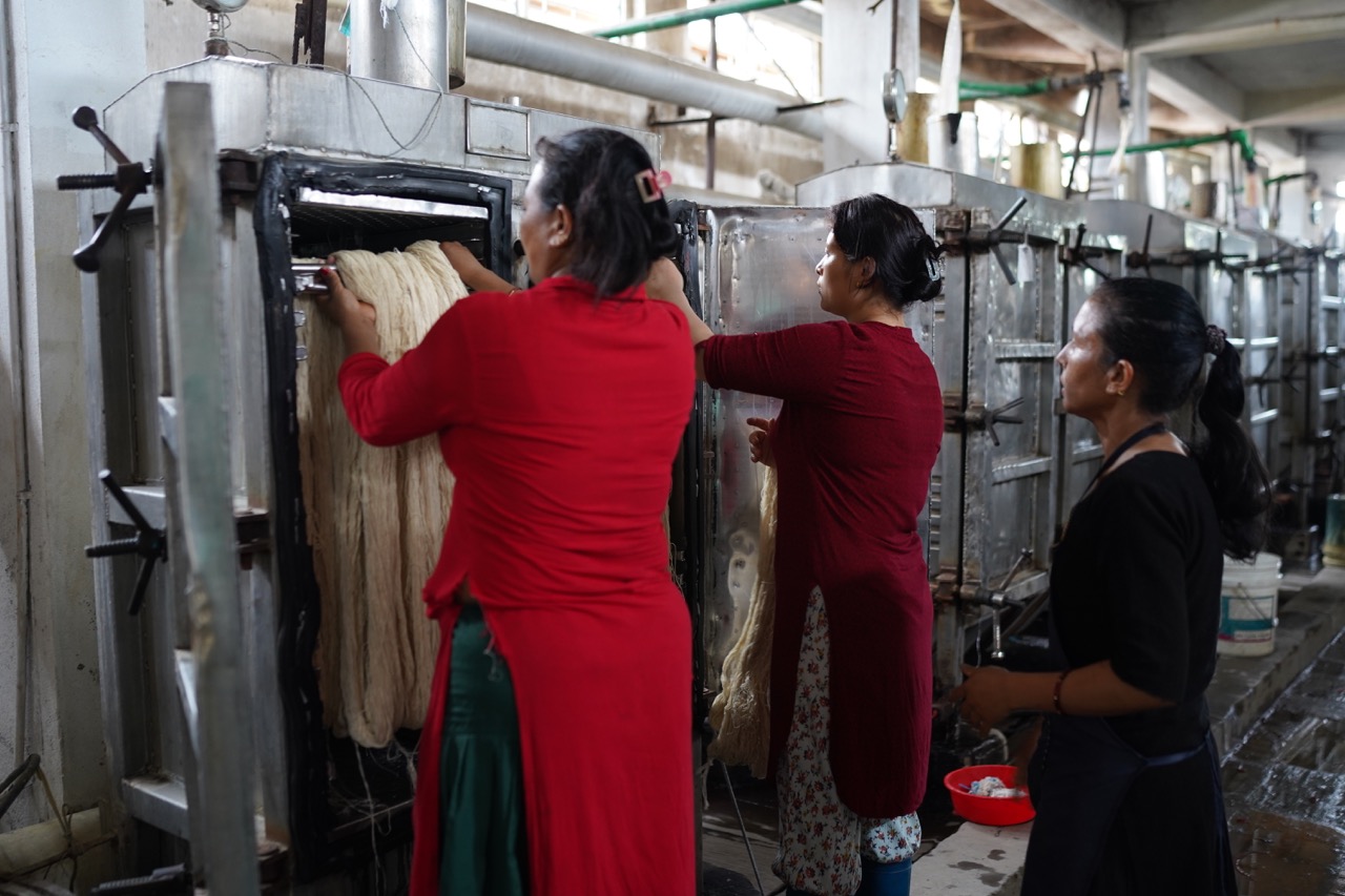 In an industry where cheaper, lower-grade dyes are widely available, the company chose a different path, blending traditional know-how with modern processes. The family-run facility works with azo-free synthetic dyes and explores water-efficient techniques and improved wastewater management, prioritising quality over quantity by using high quality imported dyes known for their colour fastness and safety. Rather than pursuing large-scale overhauls like a full return to natural dyes, the team at Boudha focuses on practical improvements that balance quality, affordability, and environmental responsibility. This includes upgrading equipment, refining processes for better resource efficiency, and continuing to use safer dye formulations. Their steady, specialised approach supports clients’ demands for quality while responding to international expectations for more ethical and sustainable production. And in 2025, the workshop is able to process an impressive 20–25 tons of yarn per month, working with wool, silk, hemp, and other natural fibres.