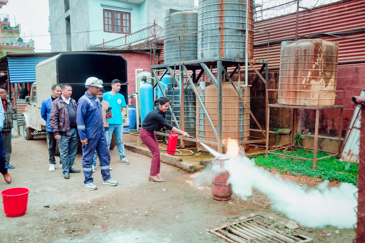 Fire Safety: The training included a detailed explanation of fire classifications (A, B, C, D) and the immediate response to fire emergencies, such as using the PASS method (Pull, Aim, Squeeze, Sweep) to operate fire extinguishers. Participants also learned how to recognize different fire sources—such as gas cylinders, factory fires, and explosions—and discussed emergency preparedness within units, including fire protection devices, installation of smoke detectors, and identifying collection points. There were hands-on demonstrations on using fire extinguishers and making use of locally available items to combat immediate fire risks.